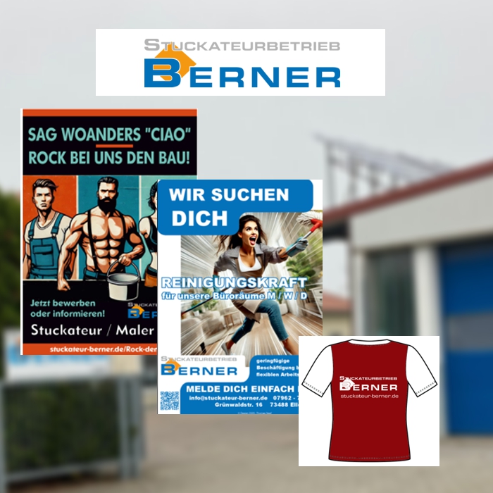 Im Anschluss entstanden professionell gestaltete Flyer, Gerüstplanen und Werbeschilder, die das neue Erscheinungsbild konsequent fortführen. Durch klare Gestaltung und hochwertige Druckqualität wird die Marke Stuckateur Berner auf Baustellen und im öffentlichen Raum wirkungsvoll präsentiert.